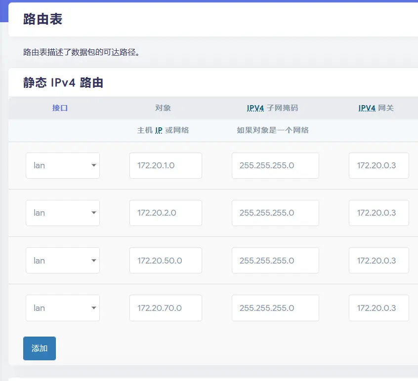 通常来说,如果我们划分了另一个网段,流量是需要通过网关来进行路由的。例如 LAN 网段为 172.20.0.0/24,然后我们在家庭 PVE 服务器上创建了一个用于虚拟机的 172.20.1.0/24 网段,其中 PVE 服务器的网卡的 IP 为 172.20.0.3 ,为了能够使得 LAN 的设备能直接访问虚拟机的 IP 段 172.20.1.0/24,就需要在网关设备上添加一个静态路由,指向 172.20.1.0/24,如下图。
