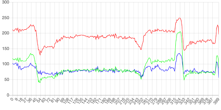 通常每个通道的取值范围为 0~255 (2^8-1)。若单独研究一个图像的一行像素,以横坐标为像素点位置,纵坐标为通道值绘制出来,会发现一个神奇的现象: