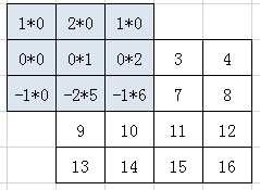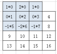 将如图所示蓝色区域的乘积结果相加,得到输出矩阵 A11 的第1行、第1列的元素的值 -16