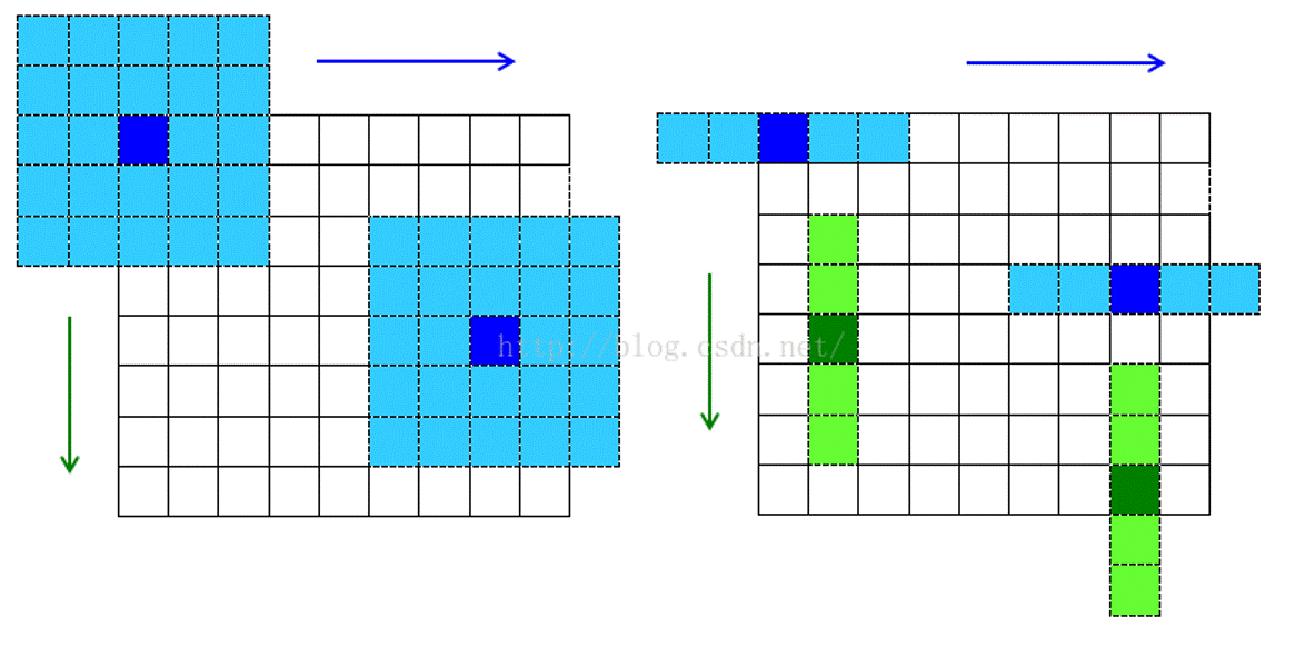 对于 5x5 的卷积核(左蓝)、1x5 的卷积核(右蓝)、5x1 的卷积核(右绿),仍有这种运算:
