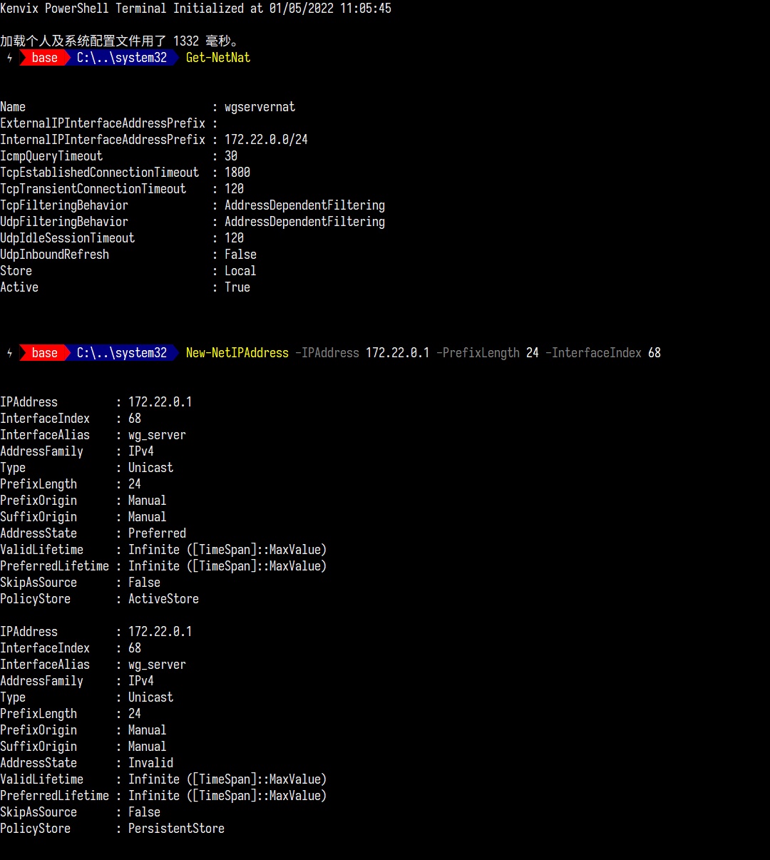 New-NetIPAddress -IPAddress 172.22.0.1 -PrefixLength 24 -InterfaceIndex 68 # 68 是我的 wg_server 的 InterfaceIndex