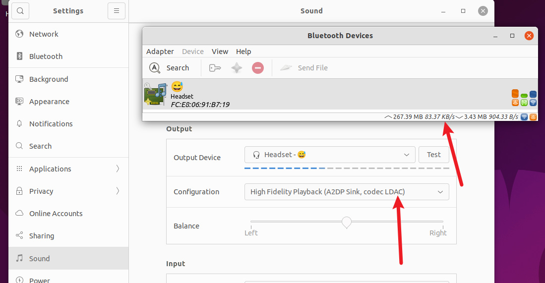 LANG=C pactl info | grep '^Server Name' - 连接蓝牙耳机,在音频设置中可以发现可以选择 LDAC 编码器了。同时观察蓝牙上传速度,约为 660kbps
